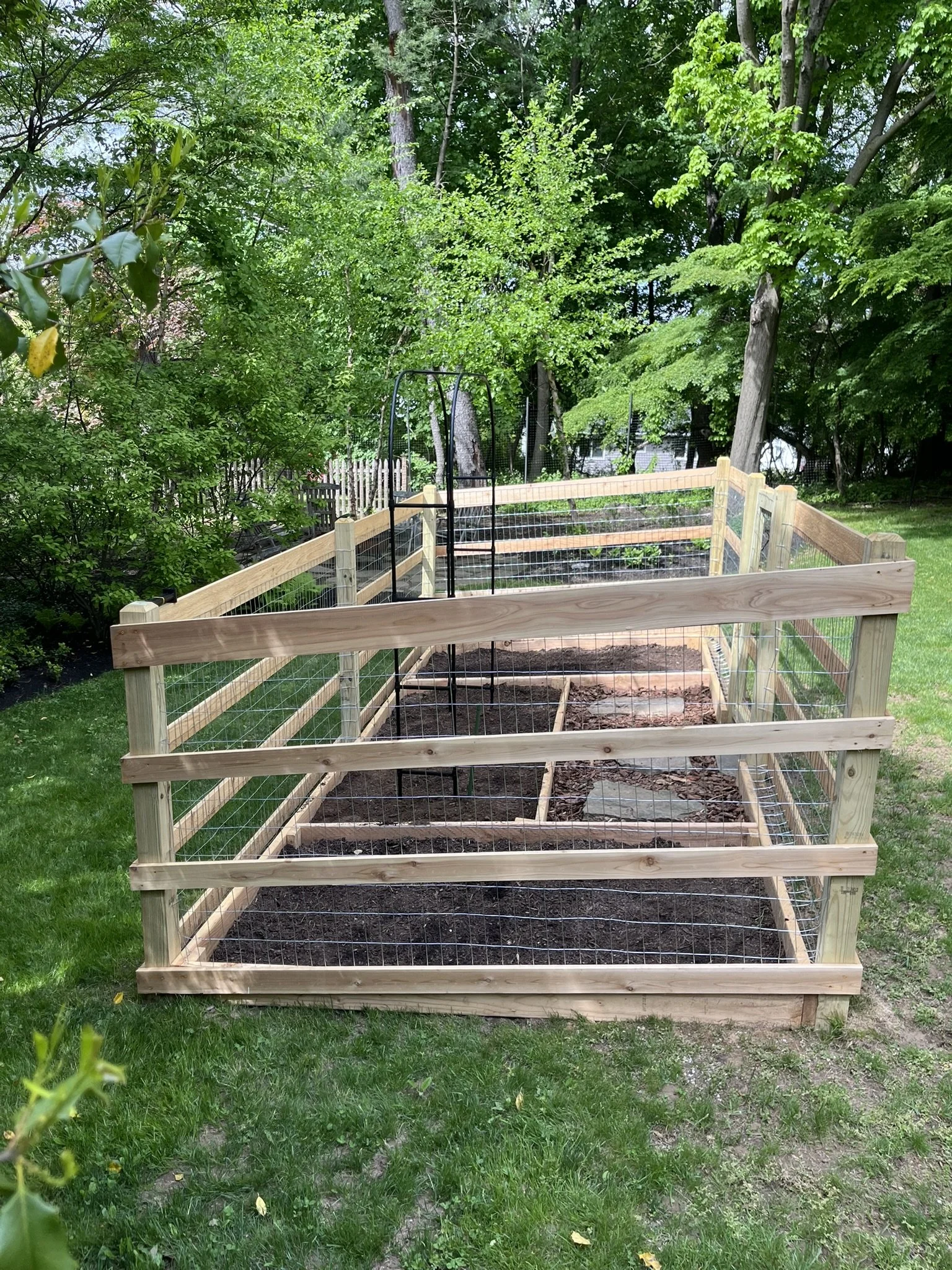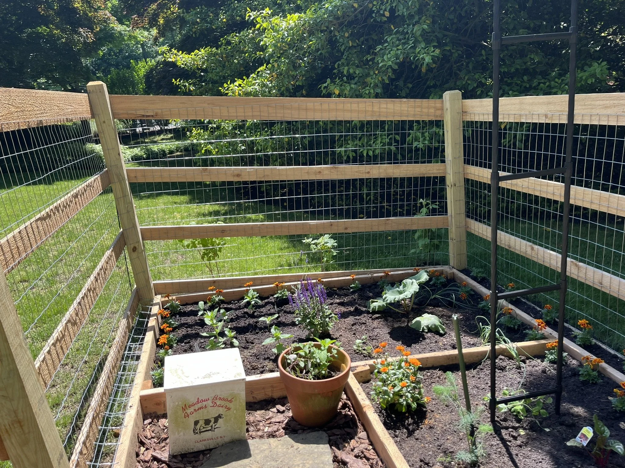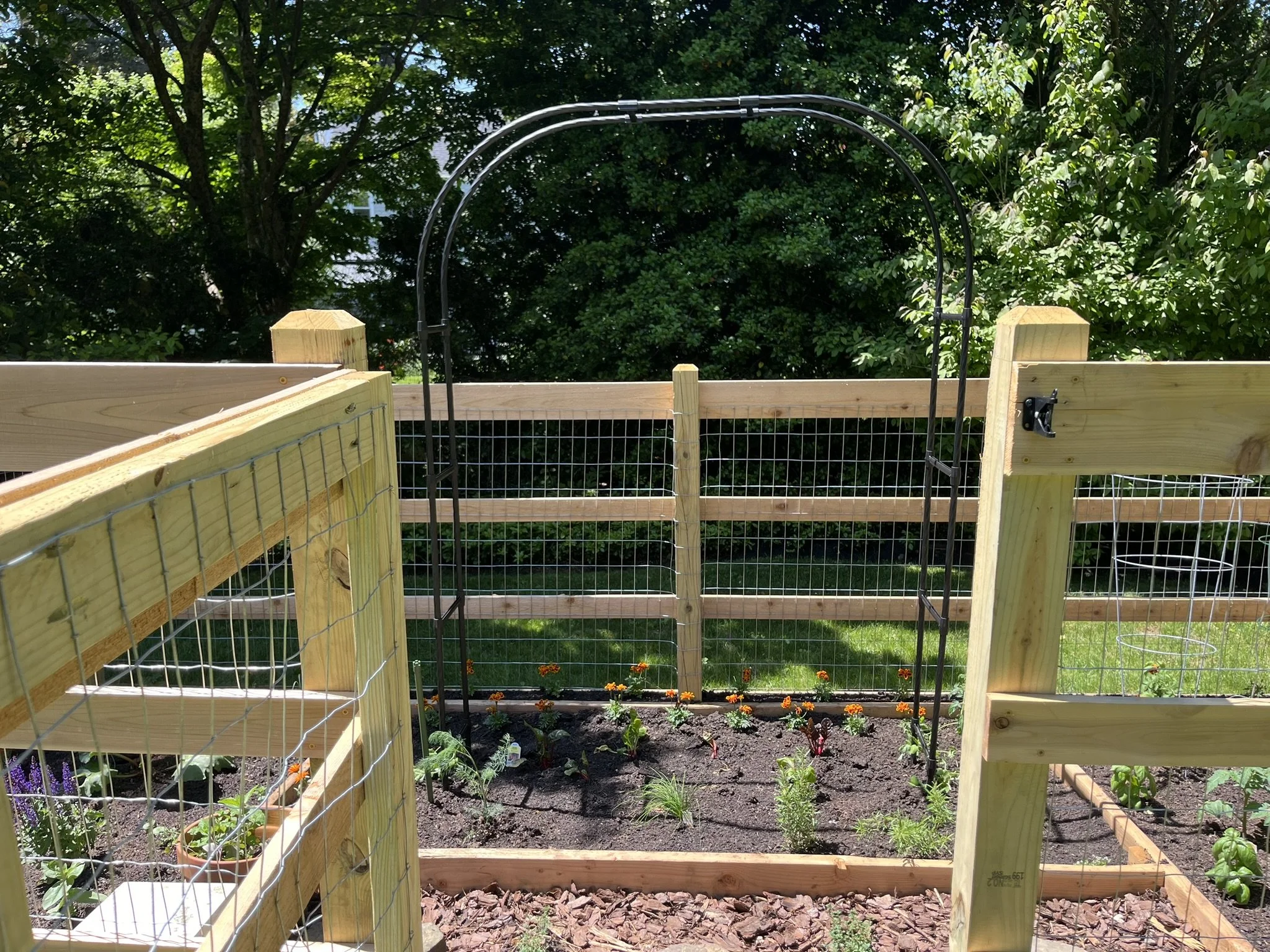 I’m really happy with how this custom vegetable garden turned out! The fully-enclosed, gated garden has welded wire fence that will keep out deer, rabbits, groundhogs, and other hungry vegetable thieves. It has three big raised beds for cut flowers, vegetables, and herbs, and a tall arch trellis for climbing beans and squashes. I worked with the homeowner on a companion planting plan that uses natural pest repellent plants like marigolds and nasturtium and pairs vegetables and herbs that helps each other grow.